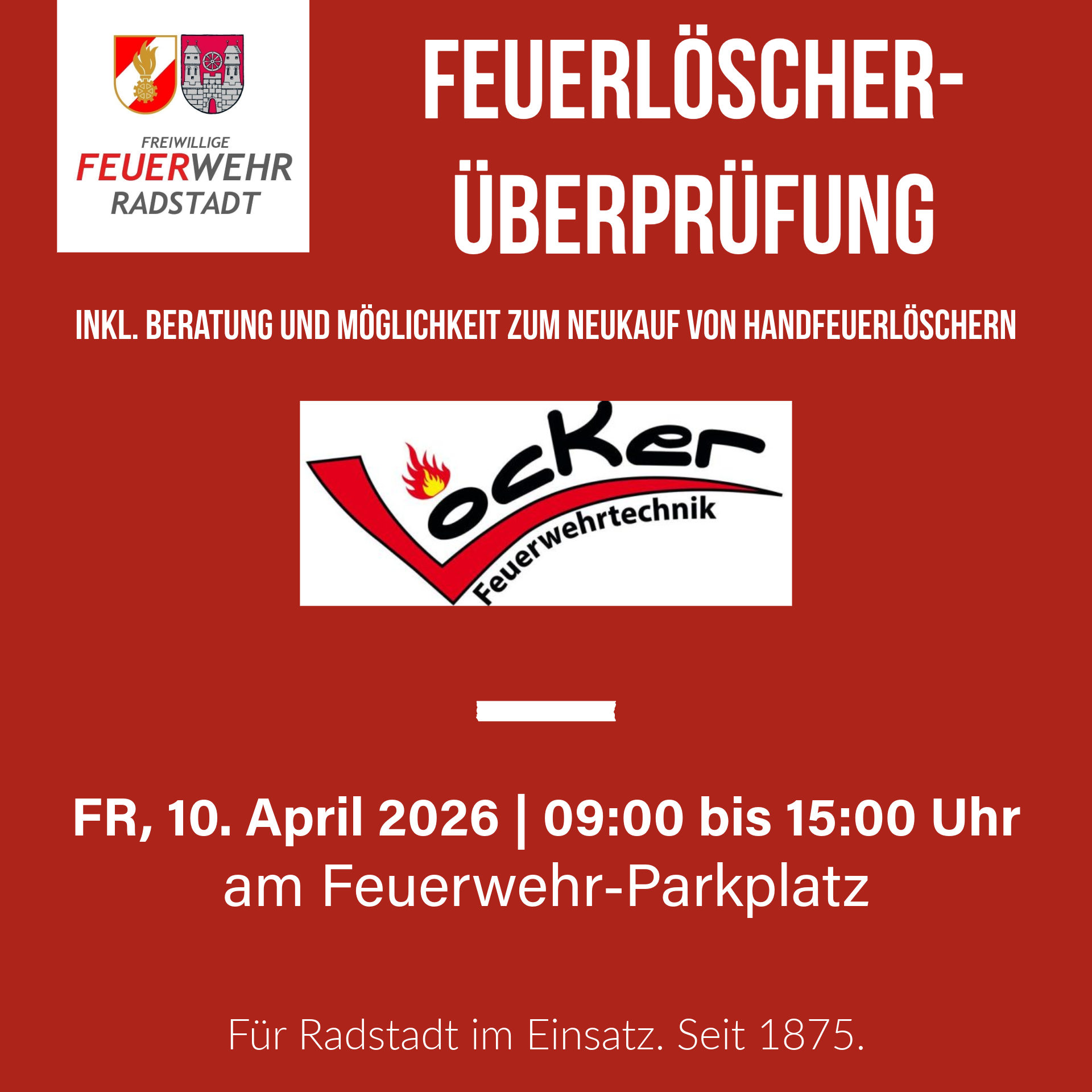 Am Freitag, 10. April 2026, habt ihr wieder die Möglichkeit, eure Feuerlöscher professionell überprüfen zu lassen – direkt bei uns am Feuerwehr-