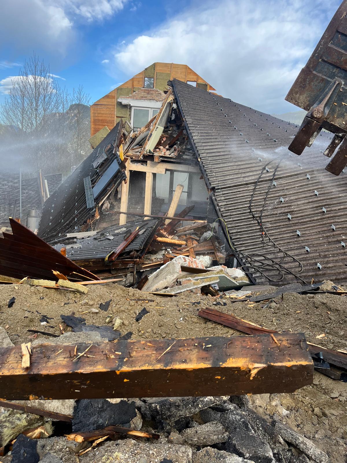 Der Abbruch erfolgte mittels schwerem Gerät durch ein Fachunternehmen, um eine unkontrollierte Einsturzsituation zu verhindern. Die Feuerwehr stellte während des gesamten Einsatzes den Brandschutz sowie die Sicherheit der beteiligten Kräfte sicher. Aufgrund der akuten Staubbelastung musste von den Einsatzkräften eine Schutzmaske getragen werden. Die verbauten Baumaterialien wurden bereits vor Ort entsprechend getrennt, damit die fachgerechte Entsorgung gewährleistet ist.