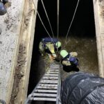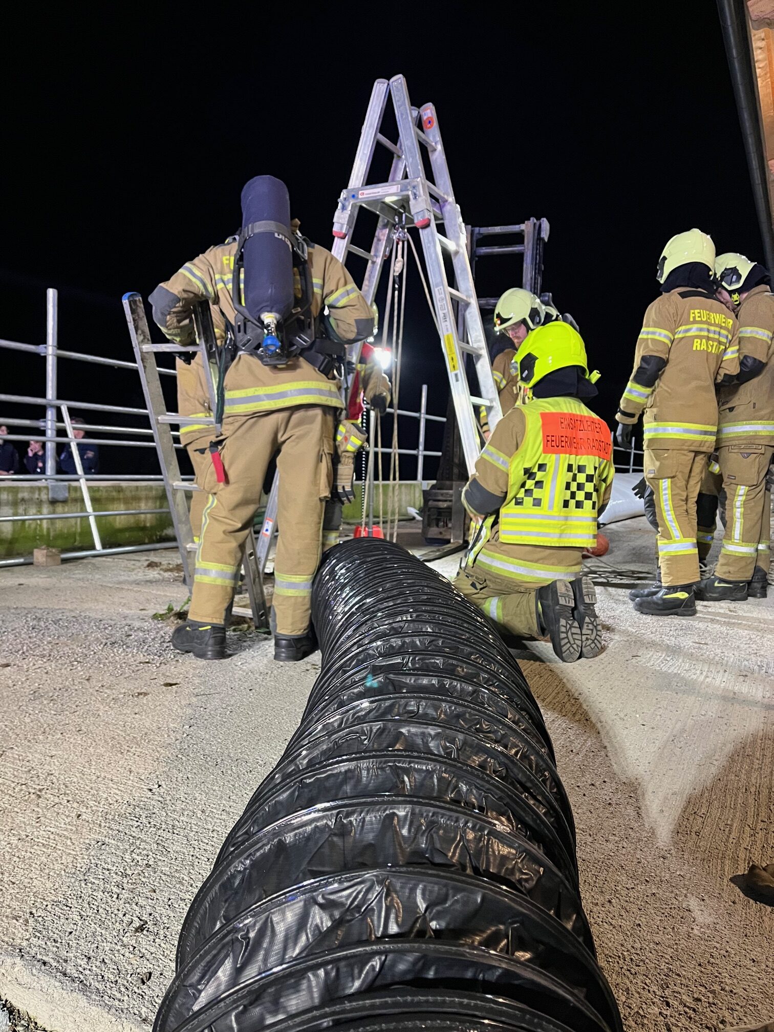 Nach dem Eintreffen der Einsatzkräfte wurde die Grube zunächst mit einem Be- und Entlüftungsgerät belüftet und anschließend der Sauerstoffgehalt mittels Mehrgasmessgerät überprüft. Die Messungen ergaben unbedenkliche Werte. Daraufhin begab sich ein Atemschutztrupp in die Grube, um das Kalb aufzuspüren. Das Tier konnte unverletzt lokalisiert, gesichert und für die Rettung vorbereitet werden.