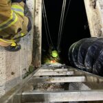 Mittels Rettungstuch sowie einem aufgebauten Leiterbock gelang es den Einsatzkräften, das Kalb schonend aus der Grube zu heben und dem Landwirt zu übergeben.